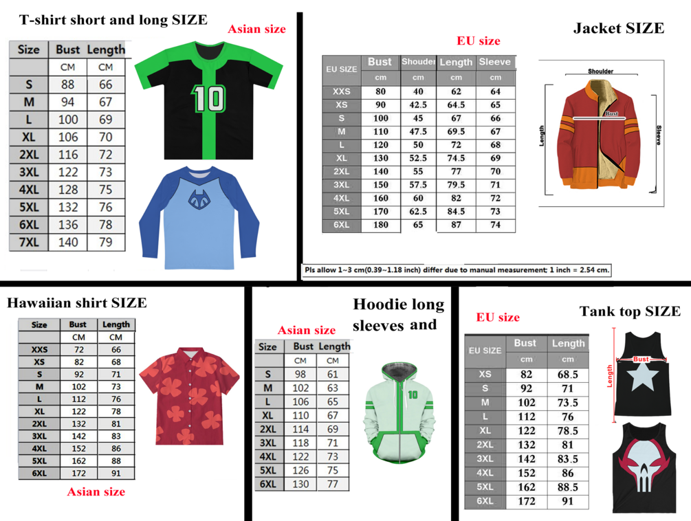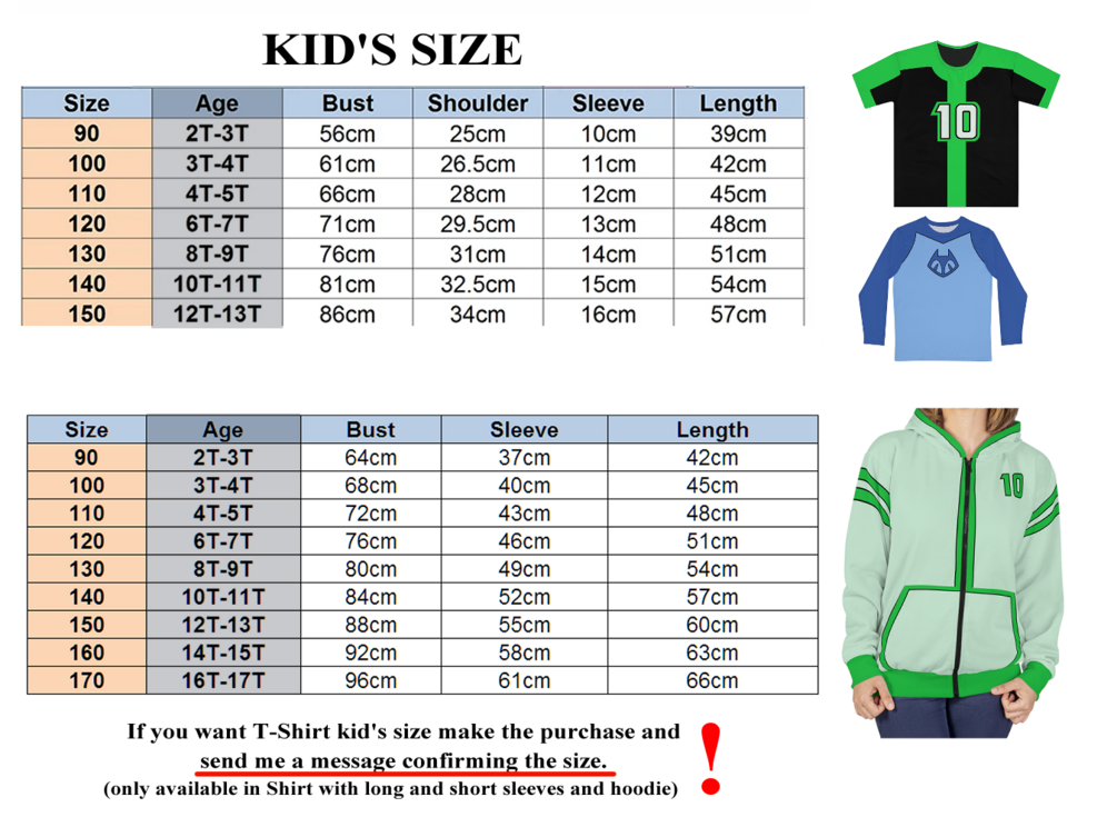 UNISEX SIZE! The sizes are Asian, please compare the measurements with those of your country (measurements of Chest and Length) due we no longer make changes or refunds if you choose an incorrect size.